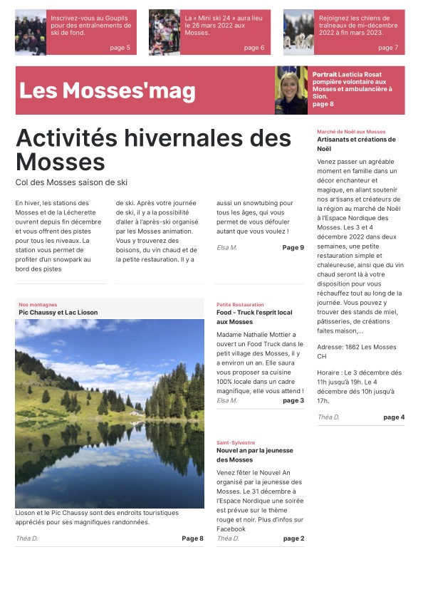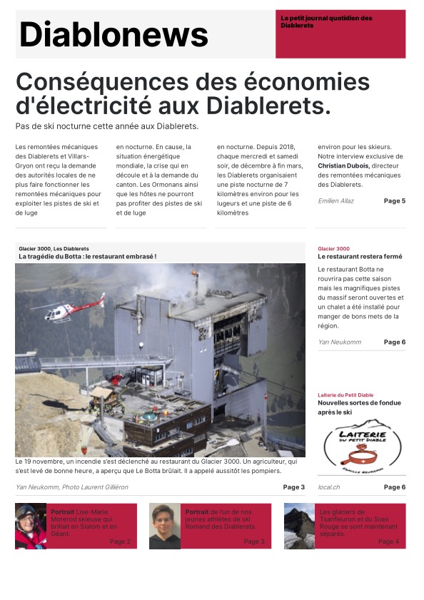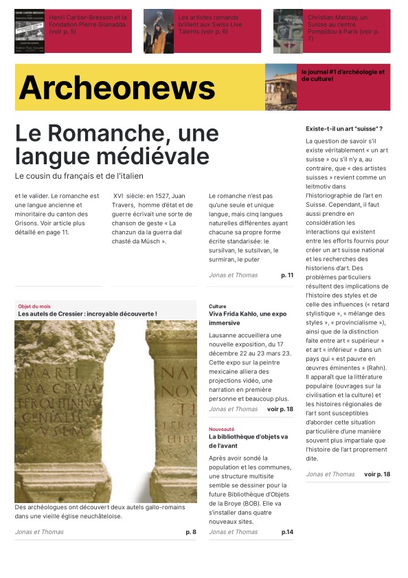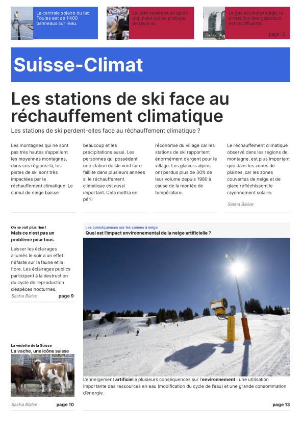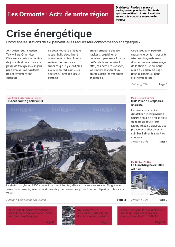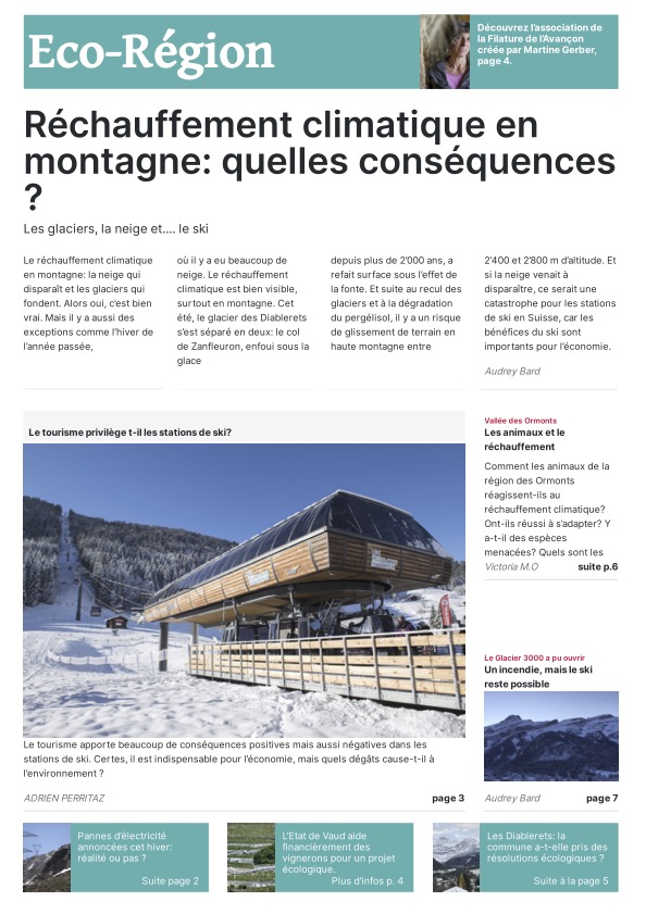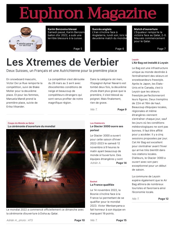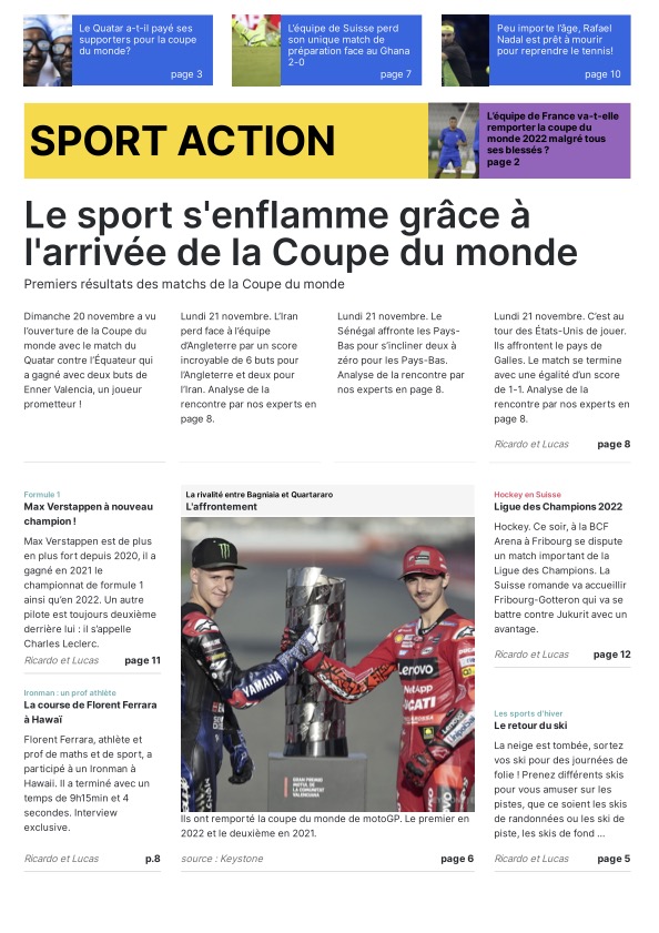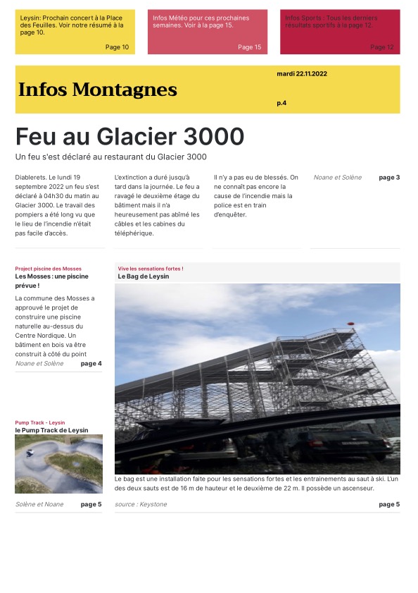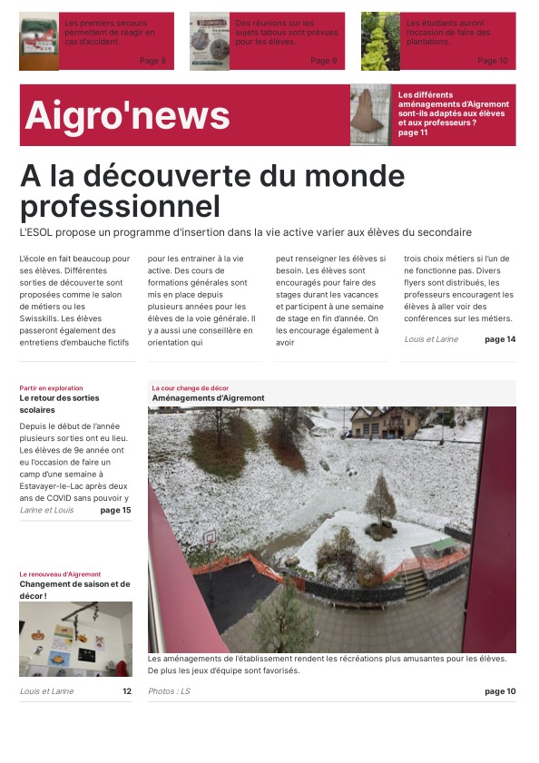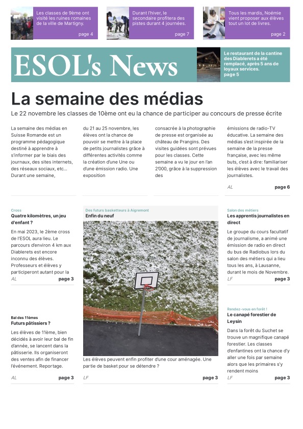 Les journalistes en herbe ont eu toute la journée pour choisir leur modèle de Une, trouver des idées d’articles, de belles photos pour les illustrer ainsi que des titres accrocheurs. Grâce au programme « Scolmag » proposé dans le cadre du concours, la mise en page de ces Unes donne un résultat très professionnel ! Mmes Ruegg, Hengartner, Thomi et Sofia ont encadré les élèves du groupe presse écrite.