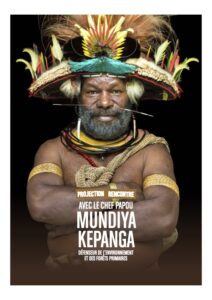 “Depuis plus de vingt ans, le chef Mundiya Kepanga participe à des rencontres publiques durant lesquelles sont projetés les documentaires dont il est le personnage principal. Il intervient également dans des établissements scolaires afin de partager son message de tolérance et de respect de l’environnement. À travers ses interventions, ses livres et ses films, il invite à rejoindre le mouvement Frères des arbres qui encourage à agir concrètement pour la protection des forêts primaires et la lutte contre le réchauffement climatique.”